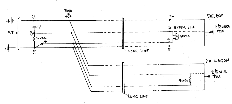 8 May : Rick, Peter and I tested the BT line to the signal box and Peter Adams wagon for hum from the bell wire. Taking off the bell wire got rid of the hum completely. We decided to use the fourth wire of the two pairs taken to each slave socket to make the bell circuit separate from the speech circuit and thereby convert the bell wires to a balanced pair. To maintain the balance we terminated each bell pair with a 4000 ohms condition. The hum vanished. Even with three wire connected phones plugged into the two slave sockets, the hum did not return despite the small unbalance this must have placed upon the circuit.