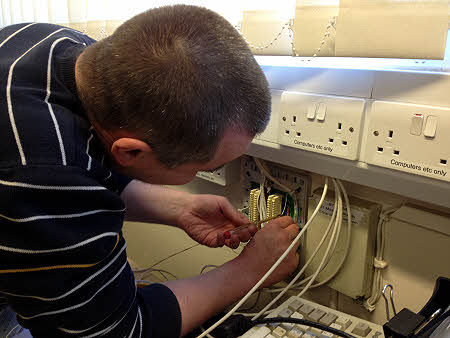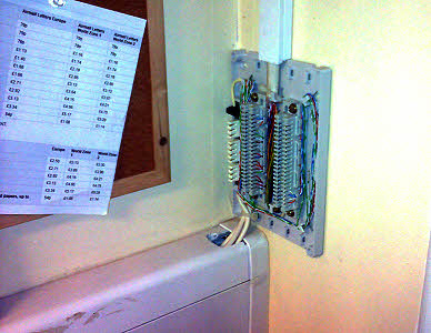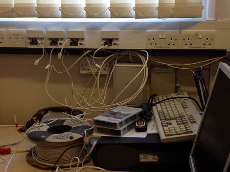 10 May : Paul, Ray, Peter and myself came in to successfully changeover the main shop line to the new system. This entailed moving the router to the new office and rearranging the CAT5 leads accordingly. Following the completion of the changeover, we also recovered the old equipment. This has considerably cleared the walls of our building of old sockets and boxes etc. It's very nice to have the job removed from the blackboard list at last. Now we can think of something else for a change. The maintenance guys can at last do some maintaining.