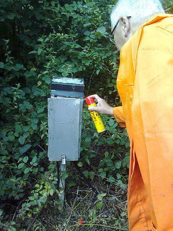 13 August : Rick and Ray went in to replace corroded connections in DP 5F. It took some time to locate the DP in the undergrowth which was cleared by Rick wielding a machete. It then started to rain despite a dry forecast. Then on removing the lid the box was almost completely full of a wasps nest which was stuck to the lid and broke apart. At this point we conducted a disorderly retreat and went to Parkend and fitted the voltmeter.
