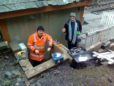 The electricians were in though. Tony Macey started to investigate the electrical service to the failed platform light at Norchard. Martin, Tony Smith and Charles oversaw the installation of a new luminaire in the Carriage and Wagon Workshop. They also examined the prospective services needed for the Bunded Oil Tank and the re-positioned GUV and the Chalet Hut. By examination the power provision to the New Cafe was confirmed to Alex Rennie. Later, Martin and Charles fitted an MCB serving the dual 13A socket in the signing on room.