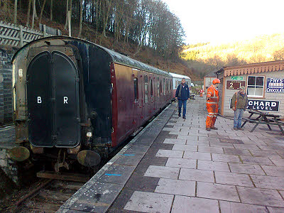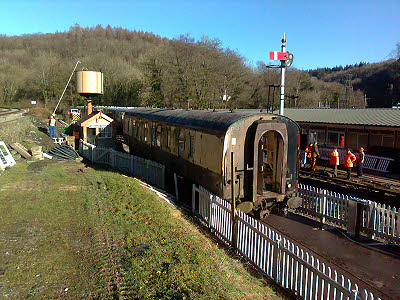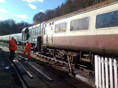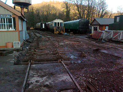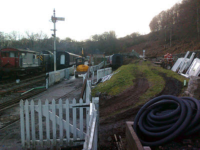 The programme of main works for 2014 is now available on this website. 11 January : Rick and Ian carefully toned out the twenty pair between DPs 3A and 5A and got the cable terminated permanently at each end. Paul and I got the cable between DPs 3R and 5A tapped out. Ian finished terminating all the cables in DP5A and has made a lovely neat job of them. Peter made up gaskets for a couple of external DPs so that they will be waterproof. We all went to Kaplan's for lunch and met Jean there. All day the big shunting job went on to take the coaches out of the siding platform and get them rearranged to make room for the new cafe building. The mark 2 has gone to be scrapped, the GUV is in its long term temporary position and the kitchen coach and 9681 coach have been replaced in the siding in the correct place to allow the new building to be erected. A very busy day for everyone at the railway and luckily the weather cooperated by having a warm sun shine on us all day.