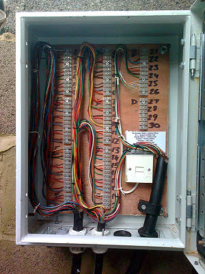 29 March : Ian, Paul and I were in for half a day, mostly sorting items for sale at next week's THG swapmeet at Bromsgrove. I also measured the resistance of a single wire to Parkend and Lydney Junction. They both came in under 200 ohms so the STARS design looks safe. Bob Hawker has two very rusty telephone cabinets ready to go to the restorers for shot blasting and painting. April 2014 2 April : Rick, Ray and Peter provided lines to phones in the Carriage and Wagon coach and to the signing on hut. They had to lay some cable from DP12 to the GUV to accomplish this. I had a chat with the Chairman to find out what he hoped to get from us for the new cafe. It seems that we will need to provide an internal line, a clock or two, a PA speaker or two, and an extra BT line for use with a phone and a point of sale machine. Broadband would be needed so that we could provide Wi-Fi in the cafe with a view to adding a couple of webcams later. The building should be ready for fitting out around the end of April, but cabling will be completed on the surface in conduit or similar. I have checked the pair usage for this project and for STARS and found that we should have enough pairs across to the platform area, but we will of course need new external grade cable to run between DP3A and the new cafe DP. We also need to convert the signal box line to become a two wire extension. This will need a new phone to be purchased. 5 April : Paul, Peter and I found the existing ducts across the tracks to DP3A to be full, so we surveyed a new duct route for telecoms cables from outside of the new office to the cafe, by crossing the tracks and going round the back of the crossing hut. Bob Bramwell has agreed to lay the duct if the scheme is approved by the Board. The duct will take a BT only cable from the BT DP to the cafe in one length. We will also provide a relief DFR telecoms cable from the MDF to DP3A on the platform and perhaps two cables from DP3A to the cafe. We went to meet Jean at Kaplan's for lunch. After lunch Peter got back to telephone wipe-up while Paul and I changed out jumpers on the IDF for the correct colours. We seem to be tidying the frame with this updating as well.