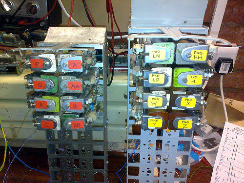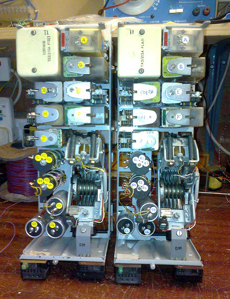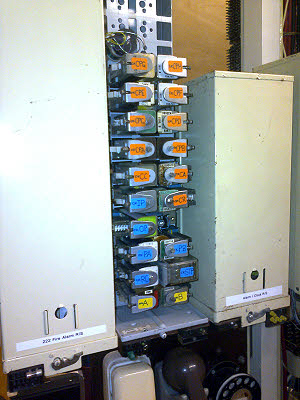 6 November : The diagram and write up for the new 4000 type selector is now available on this website. 12 November : Rick spent the day on selector maintenance and adjustments. The 4000 type incoming junction selector is now installed permanently on one of the incoming Asterisk junctions. Paul and Peter installed the PA speakers in the new cafe and got them going nicely. We had hoped to put a low/high volume switch on the speakers but even putting a 560 ohm in series with the line transformer primary had no effect at all on volume. We will need to think again and probably control the volume on the secondary side, but this will involve installing another cable from the switch. I jumpered the outgoing junctions on levels 3, 4 and 6 to the proposed distributor shelf jacks. The relay set itself is nearing completion at home. 15 November : Paul and I installed the distributor relay set and started to test. It was all over the place until we realised that we had not inserted a battery fuse. Then it worked perfectly so far as we can tell. The relay set is now in service.