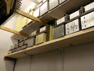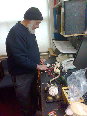 Peter, Paul and I spent the rest of the day building a new work top in the hut. We finished the day with the top complete from a building point of view but it now needs several coats of good hard varnish before we wreck the top. We await comments from the Wednesday Gang! 16 November : I went in and got a couple of coats of varnish on the work bench. The information regarding the Outgoing Junction Distributor is now on the website. 18 November : I went in yesterday and finished the varnishing, and today Jean and I went in to clean up and tidy round the room. Jean did a good job on the floor but will we keep it clean? 19 November : Tony Macey spent the day getting a ring main extended to a couple of extra sockets for our new bench. He also located a double five foot fluorescent fitting in the caboosh for fitting next week. Rick and Ray did some maintenance and also provided a hi/lo switch on the cafe PA speaker. I located a 50 volt power unit for the bench and got it repaired and working again. 22 November : Peter spent the day finishing off his wooden cased modern phone for Parkend box. It looks good. He also did some tidying in the office. Paul and I went to Parkend to get a couple of relay set shelf jacks. However whilst there we found one of the batteries split and another leaking. They are still working but need replacing. Back at Norchard Paul and I have started on cabling out for a couple of level 0 ten line uniselector finals for special services. 26 November : When Rick arrived this morning two people told him that the phone at the abutment was ringing continually and had been since Sunday. After tea and cakes he rushed to the abutment to check.