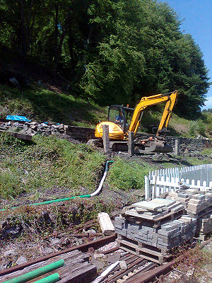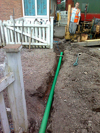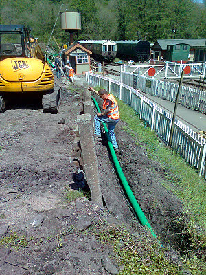 Bob Bramwell's lads started to dig in the new duct route and were stopped by Jason and Scott who offered the use of the digger. We had a most productive day, getting a good length of duct into the ground along with the cable that needed to be buried with the duct. Peter came in to work on phones but he is now down with the odds and ends and only managed to make up one complete phone. He does however have four KLUs from Mike Stephenson to wipe up and see what he can achieve. 21 May : Rick got on with repairing the cabinet of DP3A which has deteriorated somewhat. Peter, Ray and I started at Parkend chasing out two exchange lines for lineside phones and two spare pairs for STARS alarm circuits. We connected the lines out as far as DP1E but suspect that there may be some pair reversals in the next section. We will see later. After lunch we cleared up our office so that it would be available as a ticket office for the Thomas weekend. 25 May : Sad news. I learnt today that Chris Hall of the Mid Hants Railway died on Friday 23rd May, peacefully in his sleep. Chris has been a big benefactor of the DFR over the years, in particular, the exchange at Parkend was built from equipment obtained from Chris. Thank you Chris, for your support over the last ten years.