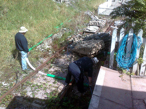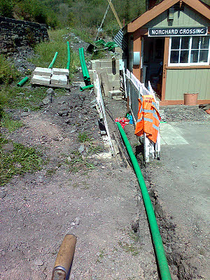10 May : Peter was in today and wiped up 4 more phones. The community pay back workers re-routed the duct and have now got as far as the the new ramp to the high level platform.