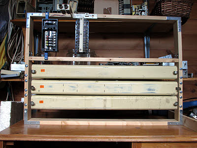 25 March : Charles was in for most of the day coordinating the electrical work at Lydney Junction Signal Box. It all worked out in the end with Western Power, EON and Tony Smith all doing their parts of the job to move the meter to a new cabinet. The power was off for some hours, so I popped in twice to check the battery. It stayed at 50.9 volts so it looks as though it is in good condition. A good job to have behind us. 26 March : A miscellaneous sort of day. I managed to sort quite a bit of stuff in our caboosh. I ended up with a tidy telecoms shelf and a bootfull of scrap cable which went to Bendall's for sale. Rick is working on brackets etc to remount the C unit shelf in the exchange. Ray and Peter completed the jumpering of DP2A and the testing of the clock circuits.