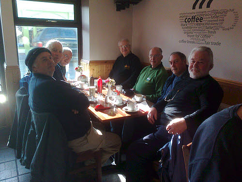 January 2014 4 January : A very good day at the DFR. We were all in. Rick, Ian, Paul, Ray, Peter and I got the DP3A to DP5A tie cable rerouted from over the siding rails to underneath the rails. We had completed this by 11:30, a job I had expected to last rather longer. The old DP5A cabinet has now been left completely empty and can be recovered by anyone who fancies the job. It did rain a bit but not enough to interfere. To celebrate, we all went to Kaplan's for lunch, where Jean, Rosie and Janet joined us.