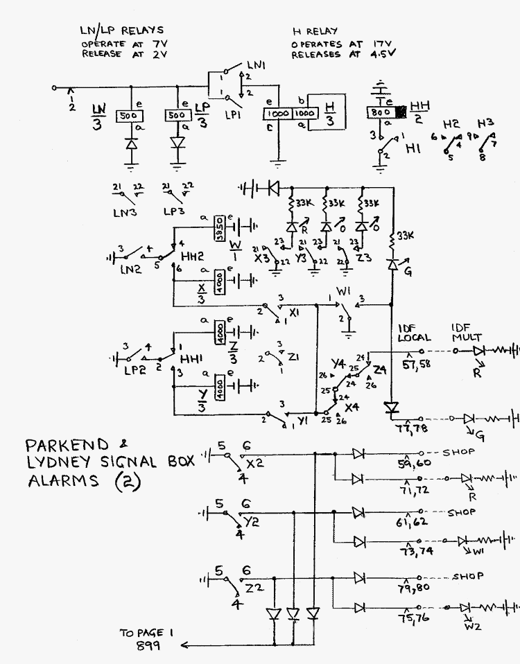 The circuit uses four main DC signals over the alarm wire, ie a light negative condition (a 2400 ohm 50 volts negative signal), a heavy negative (a 250 ohm 50 volts negative signal), a heavy positive signal, and a light positive signal. These signals are applied one after the other as required to indicate the alarms present at Parkend. The main practical problem was in finding relays that would distinguish these four conditions coming from Parkend via the single alarm wire. Relays LN and LP at Norchard needed to have a low operate voltage (4 volts)to operate to the 2400 ohm battery condition. Lightly loaded 500 ohm relays with very full windings and diodes to distinguish the direction of current flow fulfilled this requirement. Relay H needed to operate only to the heavy condition. A relay using only one of the two windings on the core and with a fairly heavy spring load and an operate value of 17 volts was found to be suitable. Luckily the railway has a large stock of 3000 type relays to choose from. One problem became apparent. The H relay being more heavily loaded than the LN relay, released faster when the alarm signal was not required. With LN still holding and H released, relay W produced a pulse and at W1 released any alarm relays already operated. We could only overcome this problem by first slugging the H relay by shorting its second winding and by also adding a slow to release relief relay HH. This in turn meant that the sending of sequential signals from Parkend had to be slowed down as well. This was achieved by the addition of the slow to operate and release AA and BB relays. Circuit Operation At Parkend, there are three relays, P, Q and R which are normally held operated by a loop when there are no alarms. P4, Q4 and R4 prevent relays A, AA, B and BB from operating. With AA2 and BB1 released, a light negative condition is sent to line on the single wire to Norchard. This holds relay LN operated, but does not provide sufficient line current to flow to operate relay H. LN2 operates relay W which at W1 lights the green alarm clear lamp. W1 also ensures that relays X and Y are not held from any previous alarm condition. This is the normal standing condition. Should the power fail at Parkend or the cable become faulty, LN will release and the alarm clear lamp will dim. Should a fault occur then P, Q and/or R will release. Say relay P releases. P4 initiates a sequence of conditions on the wire to Norchard. P4 released, operates relay A and then AA. AA3 operates B and then BB. BB3 releases relay A and AA. Relays B and BB hold via P4 released, BB3 operated, P2 released, Q2 and R2 operated and C2 released. During this sequence the following conditions are sent to line, AA operates and at AA2 connects heavy negative to line, then BB1 operates and line condition is disconnected as AA4 is operated but Q8 is also operated. When AA4 releases the line is earthed. At Norchard, we started with LN and W operated. When the heavy negative condition occurs relays H and HH also operate. LN2 and HH2 release W and operate relay X which holds via X1 to the W1 earth. X3 lights the alarm lamp appropriate to the original P relay. When the line becomes disconnected or an earth is present, relays LN, H and HH release, but X remains held to the W1 earth. If any further faults occur after the first has been sent and registered, the P, Q, R and C contact arrangement ensures that any movement of P, Q and R will cause the release of B and BB, the reoperation of A and AA, the reoperation of B and BB which will then hold to any P4, Q4 and R4 earth. The sequence is