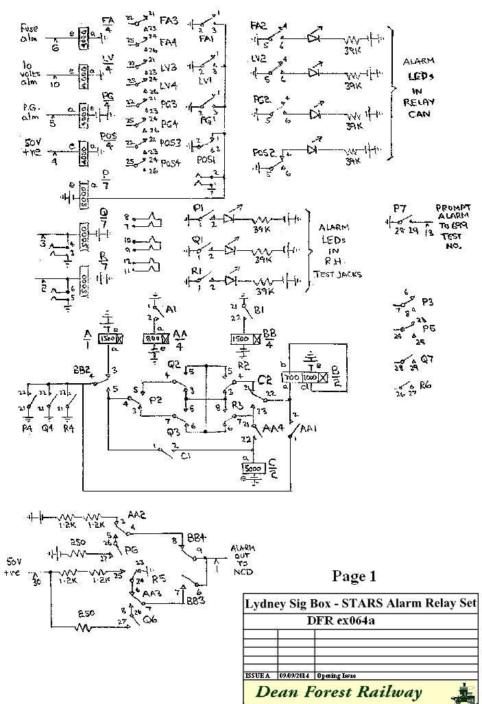 Lydney Junction Signal Box - Stars Alarm Relay SetINTRODUCTIONThis relay set is unlike the similar set at Parkend in that it has been designed to consume as little power as possible, as the power supply at Lydney Signal Box has a limited output. All relays (except POS monitoring the 50 volt positive supply) are normally released and when operated have a high resistance to reduce current drain. The LEDs are also small with high resistances in series with them.