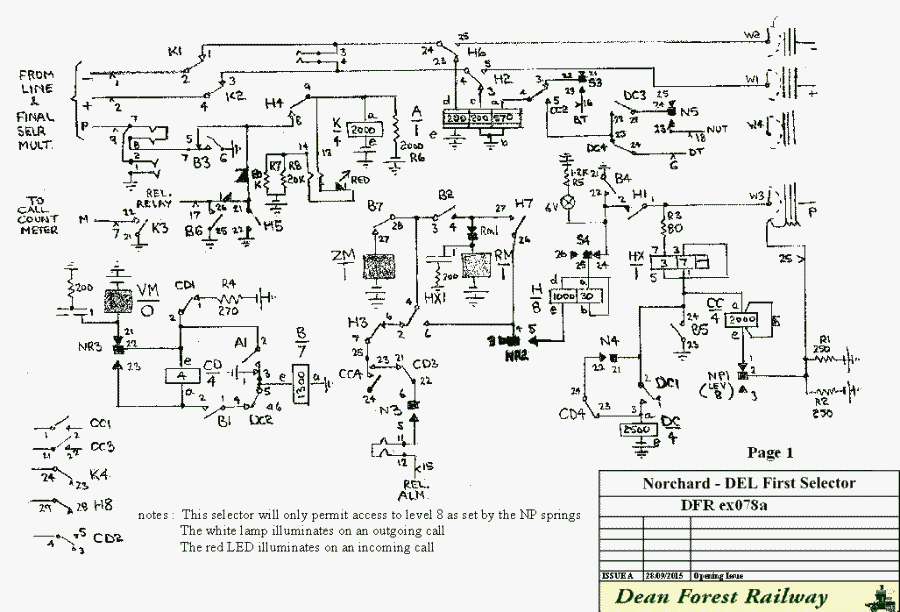 The DFR uses its UAX13 for both operational and demonstration purposes. Two demo phones in the museum generate a very large amount of traffic when the railway is running. However much of the wear on the UAX comes from people, especially children, lifting and replacing the handset. Many calls are attempted but fail due to incorrect dialling. Around 1000 calls a month succeed to operate the caller’s meter. Probably 10,000 calls fail. Everytime a call fails, over 32 magnet operations have to occur for the linefinder, first selector and allotter to obtain dial tone and release. The linefinders in particular have been hammered and have needed to be replaced. To reduce this wear, new 4000 type first selectors have been introduced. These selectors have the demo phones connected directly to their incoming - and + wires. A lift and replacement of the handset now only results in the first selector taking one step vertically and then one operation of the release magnet. Two magnet operations instead of 32. We hope this will drastically extend the life of the exchange equipment. It is also necessary for the selector to act as a line circuit on incoming calls to the demo phone. A K relay has been introduced to provide the P wire battery to the final selector multiple and to disconnect the A relay circuit when a final selector seizes the demo line by earthing the incoming P wire. The donor selectors were originally PABX4 4000 type first selectors. They possessed the necessary N, NR, S and NP springs and a set of relays largely suitable for a conversion. This has resulted in circuit elements culled from the donor selector, a UAX13 first selector and a standard line circuit. Incoming Calls When a call is incoming to the demonstration line, The final selector tests for a battery on the called number’s P wire. This is supplied by the 2000 ohm K relay in parallel with the 2000 ohm resistor so long as the selector is not busy. The final will earth the P wire to operate the K relay and light the red LED. K1 and K2 disconnect the A relay bridging apparatus. No magnets operate and when the call ceases, the P wire earth is removed to release the K relay and dim the red LED. Outgoing Calls When the caller lifts the demo phone handset, the loop operates relay A. A1 operates the B relay to the battery provided by the vertical magnet and R4. B1 prepares the vertical stepping circuit but keeps relay C short circuited at this stage. B3 earths the incoming P wire and disconnects the K relay. B4 lights the white outgoing call lamp. B5 operates relay CC. CC2 returns dial tone to the caller. During the dialling of the first digit, A1 earth operates both the vertical magnet and the CD relay. During the operate of relay A, relay CD is short circuited to make it slow to release. It holds during vertical stepping and releases when the dialled level is reached. At this point CD4 operates relay DC via the N4 contacts. If any barred level is reached, relay CC continues to hold. CC4 prevents the rotary magnet from operating. With CC2, DC3and N5 operated, NU tone is returned to the caller. Further dialling pulses will not operate the vertical magnet as DC2 has disconnected the stepping circuit. The only permitted level for demo calls is via level 8. The NP springs operate on level 8 and permit the release of relay CC. With CD3 and CC4 released The rotary magnet will drive the selector wipers into the bank. The selector will look for a battery on the P wire from the next selector. When a free outlet is reached, relay HX will operate (quickly) and at HX1 disconnect the rotary magnet drive circuit. The selector stops and HX1 connects the magnet battery via NR2 and S4 to the H relay which operates. H1 extends an earth onto the final selector P wire to short circuit the HX relay which releases. H7 holds relay H. H2 and H6 extend the loop to the final which returns an earth on the P wire to hold relay H. Relays A and B restore leaving H5 and H4 to busy the incoming P wire from the caller’s multiple. Should all outlets be busy the selector will drive to outlet eleven where the S springs operate. Relay HX operates to the 125 ohm battery of R1 and R2 to stop the selector. S4 prevents the operation of relay H, so that the A relay can return busy tone from CC2 released and S3 operated. The release magnet will be operated when both relays B and H are released. The magnet is disconnected when N3 opens on the selector reaching its normal position. A call count meter can be connected to the incoming M wire if required. It will only record incoming calls. Show the Direct Exchange Line First Selector as a PDF
